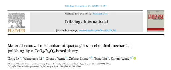 G. Lv, W. Li, C Wang, Z Zhang, T Liu and K Wang.Material removal mechanism of quartz glass in chemical mechanical polishing by a CeO₂/Y₂O₃-based slurry.Tribology International 216 (2026) 111370.