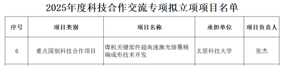 近日,威廉希官网张杰副教授牵头申报的“煤机关键部件超高速激光熔覆精确成形技术开发”项目,成功获批2025年度山西省科技合作交流专项(重点国别科技合作项目),获批经费90万。